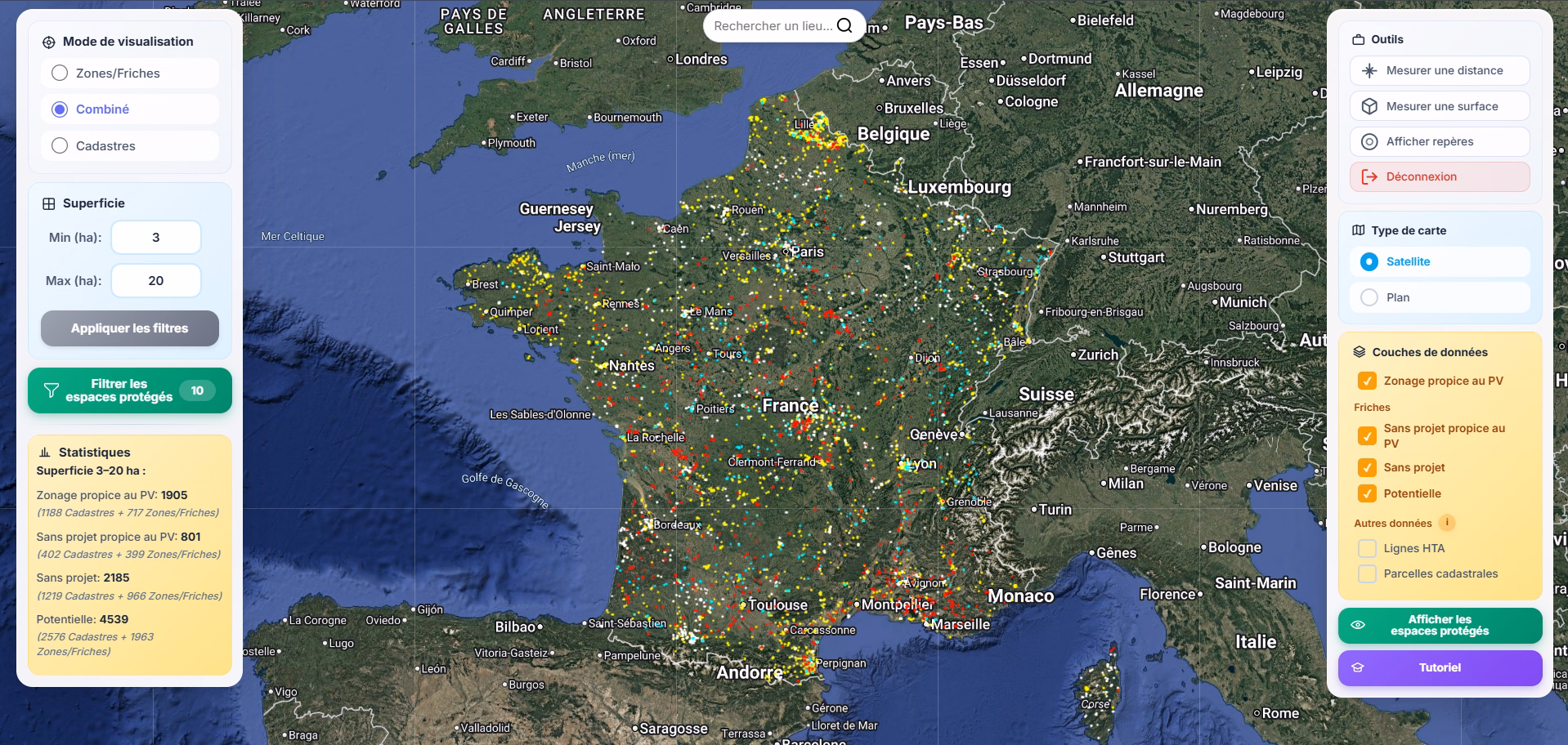 CartoPV identifie automatiquement les zones PLU, friches et parcelles cadastrales propices au développement de centrales photovoltaïques au sol. Gagnez des mois de prospection en quelques clics.